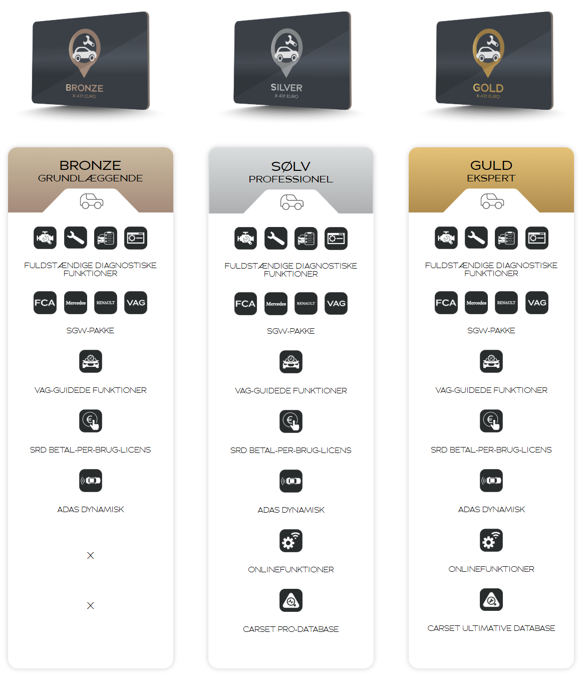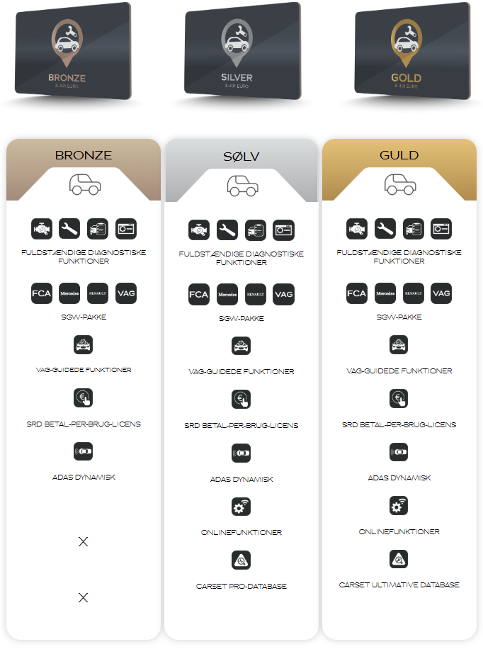 Lanseringen visar med denna modell att de fortfarande vet hur man tänker nytt och erbjuder därför denna helt nya Euro-testare som kan anpassas efter dina behov, oavsett om det är mycket krävande diagnostik eller i den lite lättare änden. Detta styrs genom att man kan beställa den med ett så kallat Guld-, Silver- eller Bronspaket. Innehållet i de 3 paketen beskrivs nedan. Dessutom är det också möjligt att beställa programvarupaketen för 1, 2 respektive 3 år.